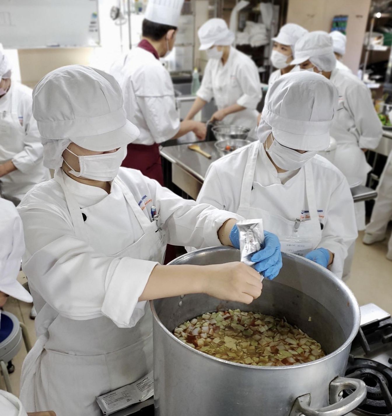 2021年10月15日、東京栄養食糧専門学校で当社のグランシェフ加藤が特別講師としてヴィーガン料理の調理実習を行いました。この日、50人を超える生徒たちが加藤氏の指導のもと、ヴィーガンのアラビアータ、ミネストローネ、サラダと野菜ドレッシングの各グループに分かれて実習に臨みました。